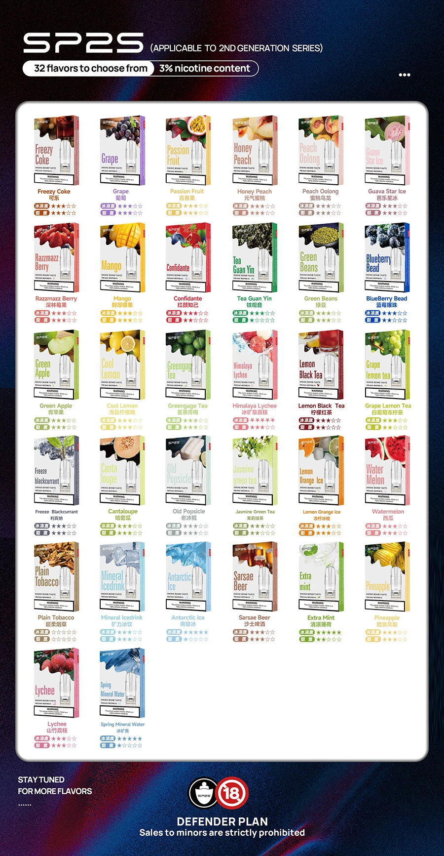 SP2S煙彈專注於極致的還原度,接近傳統香菸的真實風味,滿足對經典吸煙體驗的需求。 - 多樣化口味,選擇豐富